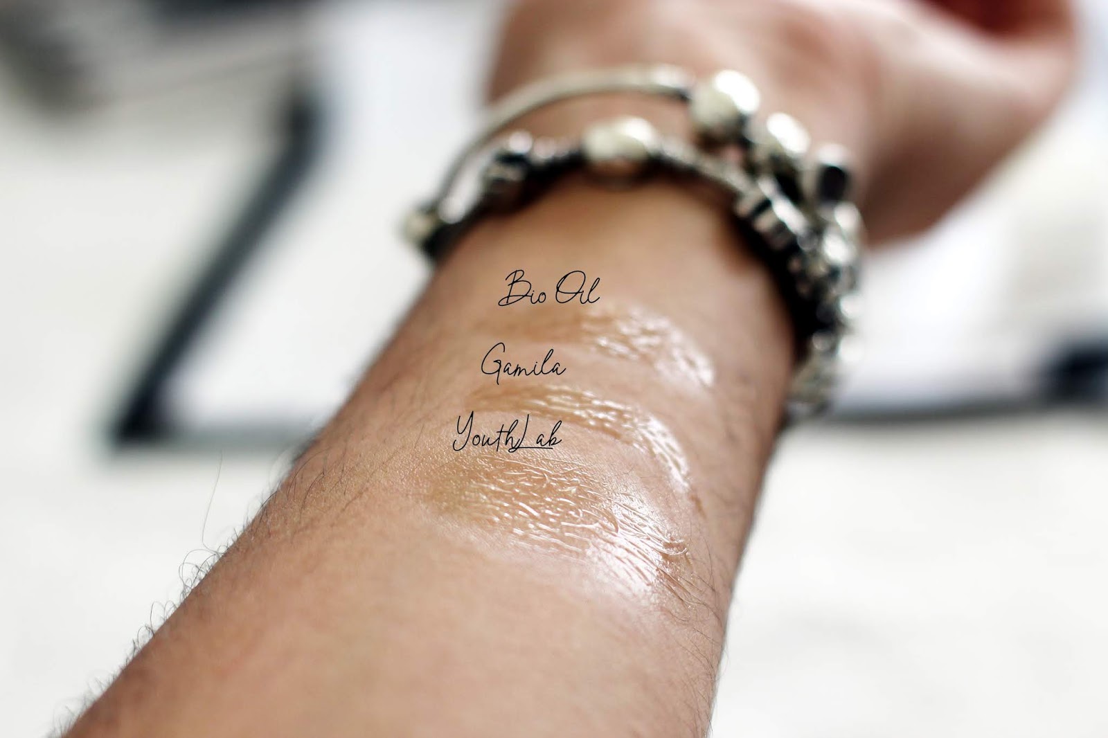 Vamos cá falar em oleosidade, texturas e coisas que tais. Incrivelmente, a ordem - que foi feita ao casaco -, vai mesmo do mais para o menos oleoso. O Bio Oil é o mais oleoso de todos, pelo que recomendo o uso noturno. O Gamila, é o que tem o cheiro mais intenso e uma textura menos oleosa que o anterior. A pele vai absorvendo a oleosidade durante o dia (ou, quando posto à noite, no dia seguinte acordam sem brilhos!). Só pelo odor é que recomendo o uso noturno. Por fim, o Dry Oil da Youth Lab, é o que tem o melhor cheiro e que, como podem ver, absorve mais rápido. Depois de ter feito estas fotografias, o óleo já se tinha começado a dissipar, deixando a pele brilhante, o que me leva a crer que será perfeito como primer de maquilhagem, por exemplo... porque, como sabem, sou muito fã de acabamento luminosos.